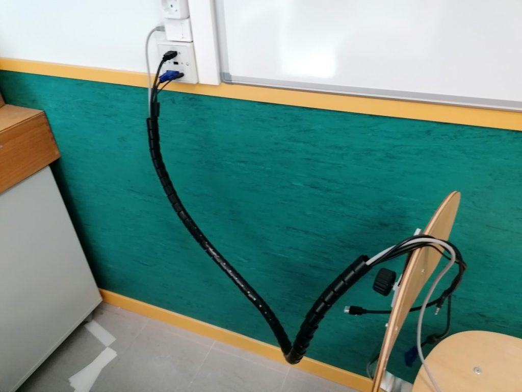 Las conexiones del proyector acaban en caja de conexiones con Hdmi vha audio y usb; junto a una regleta de corriente con interruptor la cual corta la corriente tanto de los altavoces como de los altavoces. Los cables quedan recogidos mediante espiral